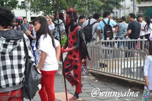Seru bukan? Tidak hanya itu ada juga pengais rezeki yang bergaya iblis dan tentu saja pakainnya juga ala Iblis. Dan patung hidup iblis ini memegang pedang iblisnya :D.