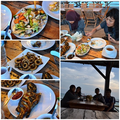 Memasuki Restauran elit Nusa, kamipun mencoba seafoodnya berupa capcay,ikan bakar,nasi, kelapa muda, lemon tea, cumi-cumi yang harganya Rp320.000/4 orang. Sebenarnya hal inilah yang membuat biaya perjalanan kami besar kalau tidak ada ini maka perjalan ke Pulau Seribu kami benar-benar perjalanan hemat dan ekonomis, tapi tidak apalah kami menikmati hidup dengan menyengakan hati dengan makanan seafood yang rasanya enak.
