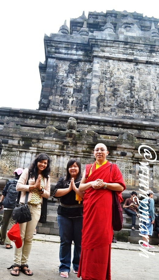 Setelah puas mengamati, aku dan Yessi melihat orang heboh berphoto dengan Biksu di depan Candi Mendut Magelang., Tak mau kalah heboh kamipun minta photo bareng dengan Biksu tersebut. Meski si Yessi shock melihat Biksu mau berphoto, aku juga tidak tahu kenapa. Tapi yah kami akhirnya ikut-ikutan photo juga dengan bantuan blogger yang entah siapa namanya yang kami minta bantuan “tolong ambil photo kami dengan Biksu, Terimakasih” 😀