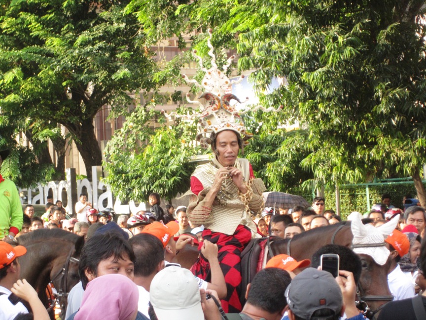 Aku dan Daboo telah siap menunggu parade karnaval di Kawasan protokol yaitu di Jl. M Thamrin karena yang paling dekat dengan kosan :D. Sebenarnya yang buat aku penasaran ialah Pak Jokowi karena dalam Karnaval Jakarta, beliau akan mengendarai kuda. Ternyata bukan aku saja, rata-rata masyarakat datang untuk melihat Pak Jokowi. Pak Jokowi memakai baju yang super beda dari yang lain yang mencuri perhatian siapa saja. Kenapa tidak? Kostum Jokowi yang unik terbuat dilengkapi dengan topi kaisar.