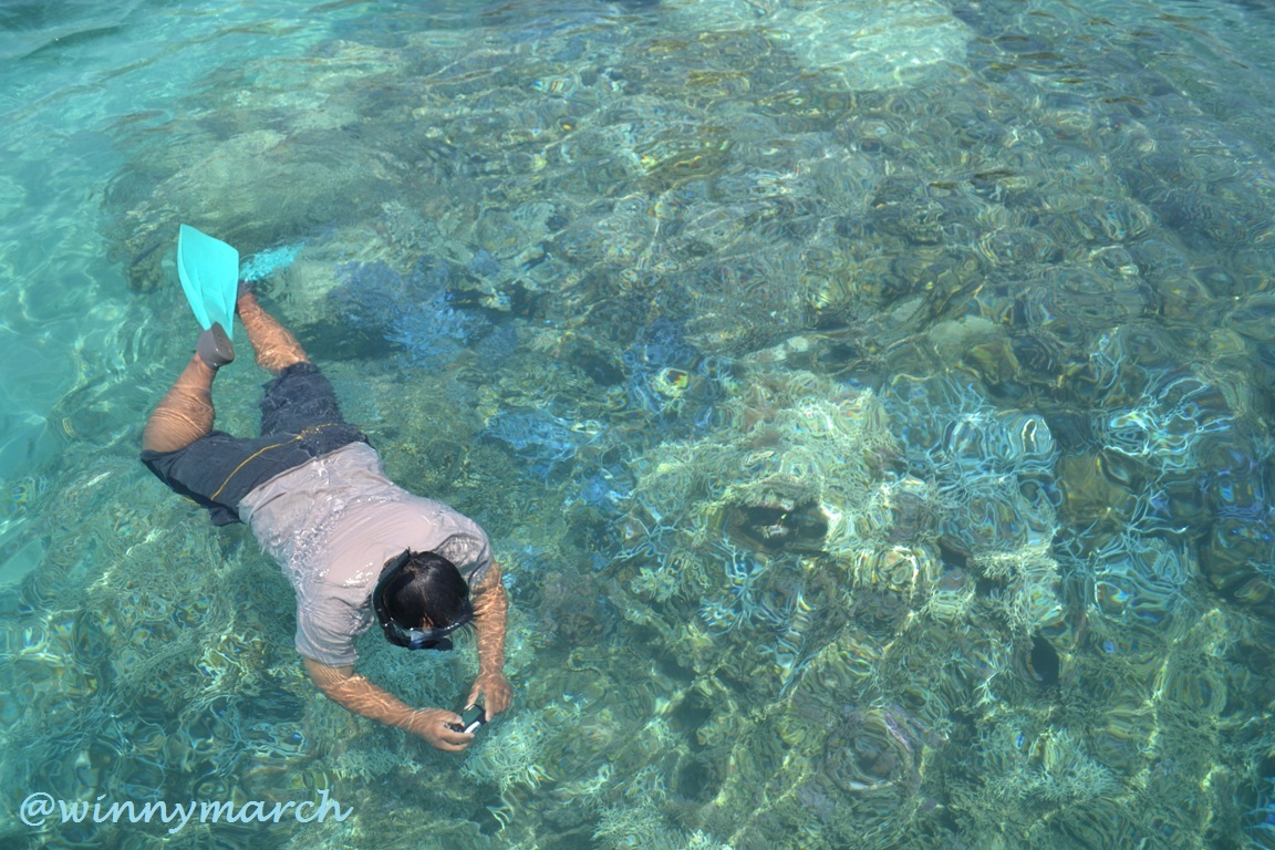 Aku, Daboo, Ade, Ari, Bobi dan Pak Yudi memilih snorkeling di Pulau Tiga kepulauan Riung karena kejernihan airnya.