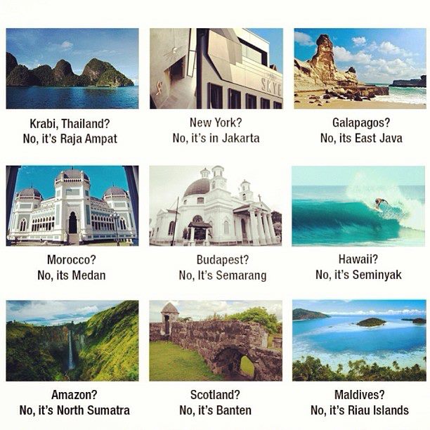 Gara-gara sebuah photo yang aku dapatkan dari instagram membuatku menulis tentang keindahan Indonesia. Yah begitu banyak tempat wisata indonesia yang menarik mulai dari Sabang sampai ke Merauke. Sebut saja wisata populer di Indonesia seperti Bali, Lombok, Raja Ampat, Pulau Komodo, Borobudur, Danau Toba dan masih banyak tempat wisata indah di Indonesia. Jadi tak heran kalau slogan untuk pariwisata Indonesia yang menyatakan “Wonderfull Indonesia”!