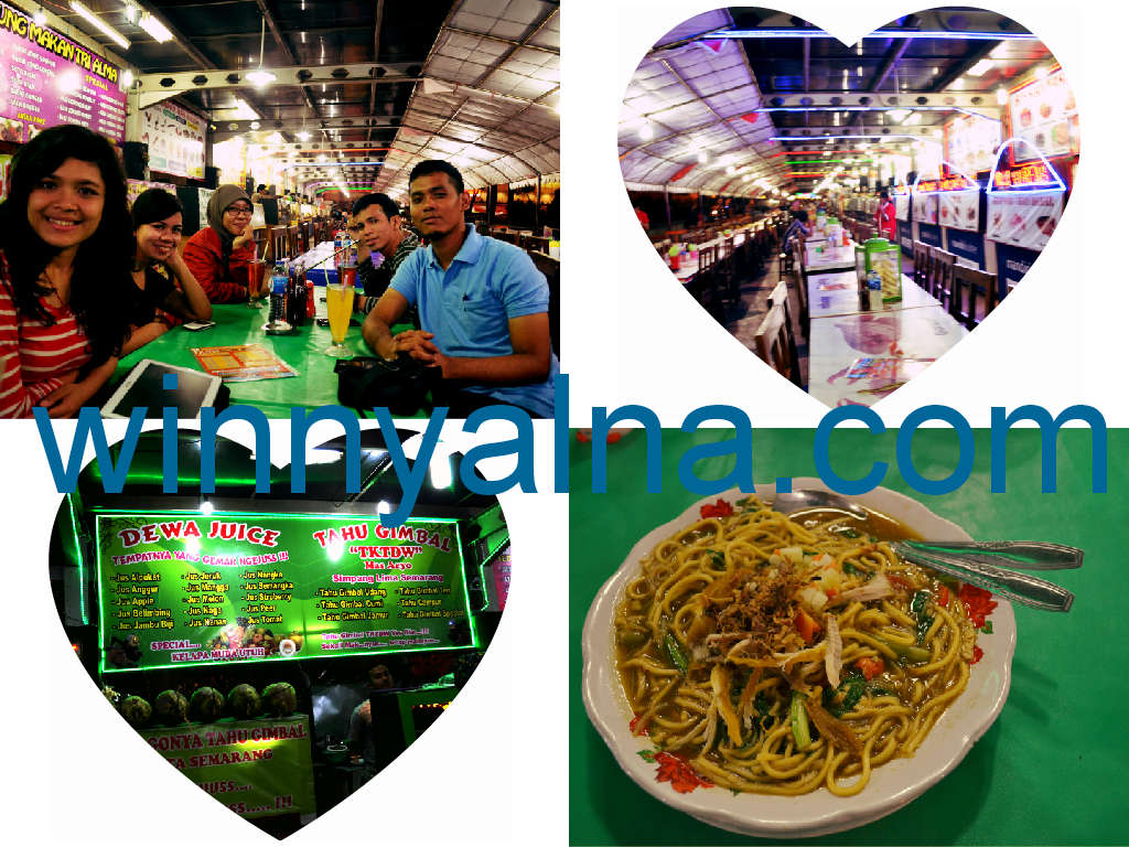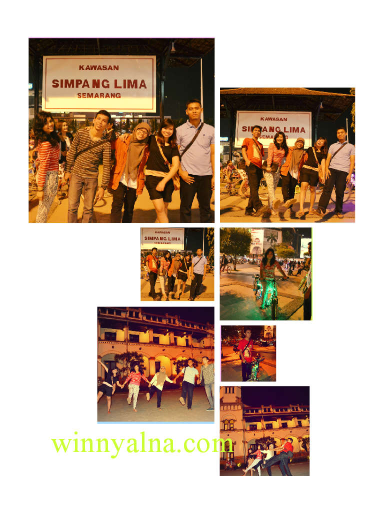 Ramai-ramai kami berjalan kaki ke Simpang Lima disertai tanda tawa. Bagi yang belum tahu Simpang Lima, merupakan taman berbentuk segilima karena memang menghubungkan 5 Jalan. Malam hari Simpang Lima menjadi tempat nongkrong masyarakat, serta bisa keliling Taman denagn sepeda yang dihiasi dengan lampu kelap-kelip. Di Simpang Lima, kami bersantai sekalian makan malam. Aku memilih makanan khas Semarang yaitu tahu gimbal yang terbuat dari tahu dengan kuah kacang. Kalau temanku malah mencoba mie rebus. 😀