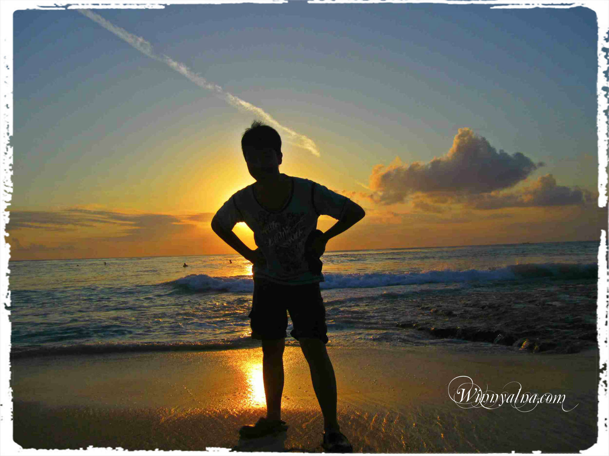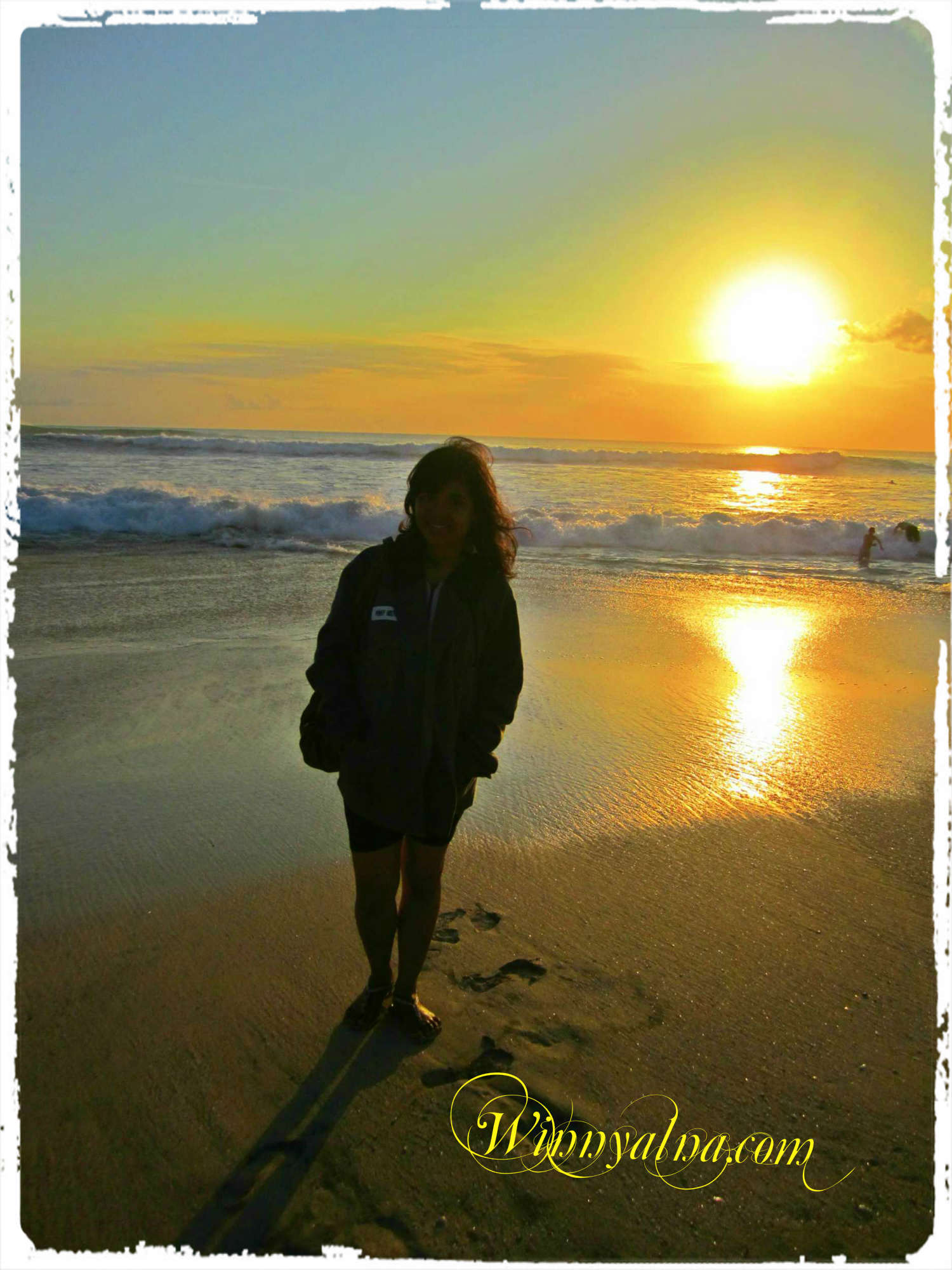 Pantainya sangat indah dan yang paling saya senangi apabila melihat keindahan matahari terbenam dari foto Winny di atas. Kuasa Allah SWT yang tidak bisa dipungkiri yang telah memperlihatkan lukisan hidup alam berputar mengikut waktunya.
