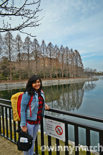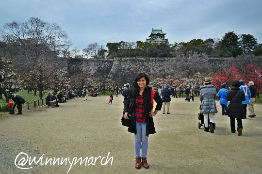 Sampai di stasiun terdekat menuju ke Osaka Castle kami berjalan kaki menuju ke Osaca Castle Jepang melewati jalanan serta tangga. Indah, rapi dan bersih sekali jalanan menuju ke Osaka castle. Apalagi saat di Osaka castle park keren! Aku yaikin Taman Osaka castle kalau awal April saja datangnya pasti mekarnya lebih yahuy! Sebenarnya yang ada di taman yang sekompleks dengan Osaka castle ialah pohon plum. Plum mirip sekali dengan sakura jadi pas lihat plum mekar rasanya excited abnget. Bunganya ada yang merah putih mirip Sakura. Paling tidak sensasi merasakan Taman Sakura KW itu menyenangkan 😀