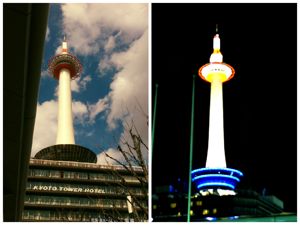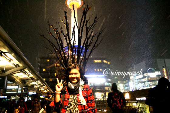 Sesampai di Kyoto Station, tepat di depan Kyoto Tower tiba-tiba “salju pun turun”. Ok selama satu hari full aku merasakan sensasi salju mulai dari Fushimi Inari Shrine walau hanya kecil saja, lalu di Arashima dan lagi-lagi sekedar salju lalu di Kyoto Station puncak aku benar-benar merasakan salju hingga aku lupa kalau itu nol derajat Celcius. Ah lupa sudah rasa gondok perjalanan, lupa sudah rasa dingin berubah menjadi senang dan semangat! I was excited! Kayak mimpi jadi nyata!!