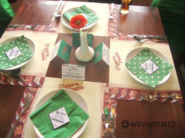 Pas masuk ke dalam maka yang lagu dengan alunan piano dari alm.Chrisye yang berjudul “Cintaku” yang dinyanyikan seorang bapak bule yang ternyata pemilik dari Signora Pasta yang bernama Guiseppe Coglitore atau dipanggil dengan Mr. Pino. Kami langsung celangak celinguk karena sudah banyak yang datang lalu kami ngasal mengambil tempat duduk yang sebelum duduk kami mengisi absen lalu dihadiahi goodie bag berisi merchandise dari Sinarmas Land yang ada isinya juga berupa mug, topi dan voucher diskon 15% di Signora Pasta BSD, serta apron berwarna hijau untuk memasak.