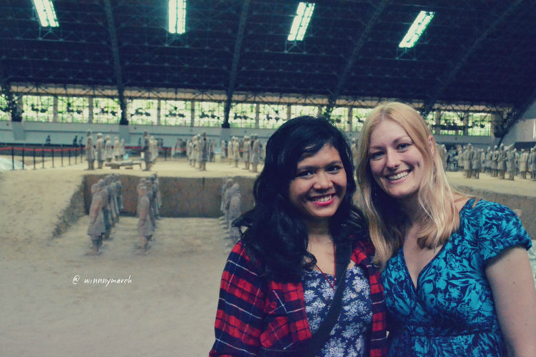 Saat asyik-asyik mengamati dan memutari Terracotta Warriors and Horses Xi’an, aku bertemu dengan Emma, teman traveller yang aku jumpain saat menanyakan dimana Muslim Quarter Xi’an. Dia juga yang memberikanku peta wisata Xi’an. Dia dan pacarnya sedang melihat terracota juga lalu aku berkata, “hi Emma, meet u again”. Terus dia langsung senang gitu sambil memperkenalkan temannya berma Rico. “Rico, this is Winny from Indonesia that i told you yesterday”.