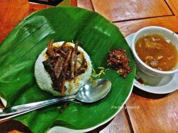Berboncengan kami menuju ke warung Bu Azzah untuk mencoba nasi krawu eh tapi yang makan aku doang. Untuk nasi krawu sendiri memiliki kekhasan tersendiri dari nasinya yang pulen disajikan diatas daun pisang serta terdiri dari lauk berupan sayatan daging atau jeroan kemudian dilengkapi dengan sambal terasi serta kuah semacam sup.