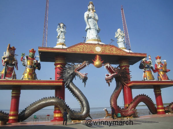 Untuk patung kwan in sebenarnya aku tidak tahu kalau masih satu kawasan dengan patung buddha 4 wajah terus tahunya karena ada bapak yang nyuruh masuk karena lokasinya berada tepat di depan Patung Buddha. Terus masuk ke dalam nuansanya pintunya mirip mini Bali terus masuk ke dalam rupanya vihara terus masuk ke dalam lagi tradaaa ada gerbang dengan dua naga terus diatasnya Patung Kwan in terus dibelakangnya hamparan Pantai Kenjeran. Awalnya aku kira kayak Patung Kwan in yang di Siantar atau yang Hatyai rupanya yang ini tak kalah unik apalagi dibelakangnya latarnya Kenjeran beach heheheh 😀