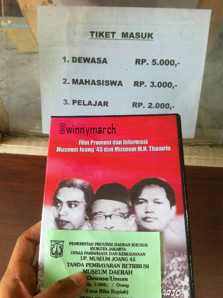 Aku memutuskan untuk napak tilas Proklamasi dan Menyambut HUT RI ke Gedung Joang 45 Jakarta alasannya ingin menggali lebih dalam tentang sejarah serta gaya bangunan Gedung Joang 45 itu menarik. Lokasi Gedung Joang 45 berada di  Jl. Menteng Raya No.31, Menteng, Jakarta Pusat. Tiket masuk ke dalam Gedung Joang ’45 atau Museum Juang 45 untuk dewasa Rp5000, mahasiswa Rp3000 dan pelajar Rp2000. Saat masuk aku hendak masuk maka aku ke loket tiket terus dikasih karcis sekaligus kaset yang berisi tentang informasi Mueum Joang ’45 dan Museum MH Thamrin. Gila travelling murah di Jakarta banget, aku emang pecinta museum deh 😀