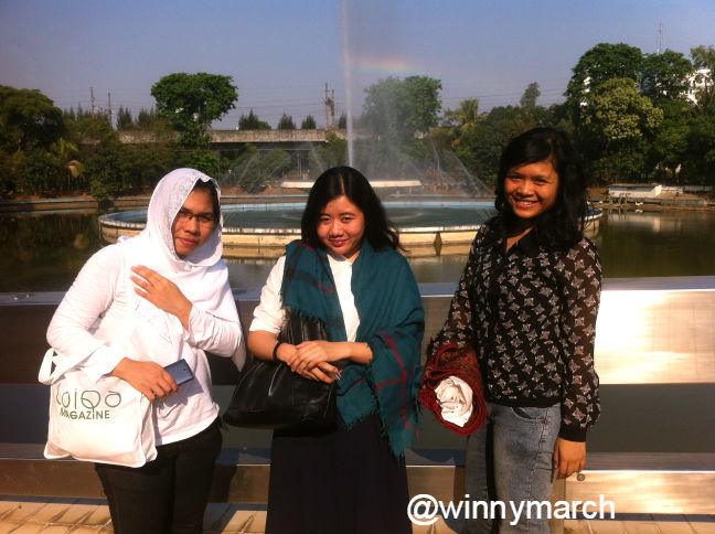 Pas pulang Idul Adha aku, Gladies dan Indri melihat pelangi di Air mancur di tengah kolam sudut barat daya taman Masjid Istiqlal. Beruntung ya 😀