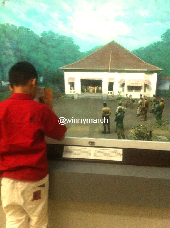 Memasuki museum aku melihat gambaran perjuangan Indonesia dalam karikatur mini yang mirip di Monas lalu di depannya ada informasi tentang replika kejadian tersebut misalnya kejadian Bandung Lautan Api. Lucunya ketika aku melihat seorang bocah yang begitu antusias menulis informasi yang ada di depan papan informasi.