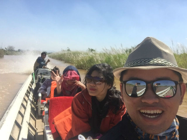 Kehinaan lainnya yang kami lakukan di Myanmar adalah ketika saat  pulang tidak jadi hunting sunset di Danau Inle. Akhirnya kami bertiga bergaya bak “Saudagar kaya raya” dengan naikin kaki di perahulah, berphoto ala-ala. Padahal senangnya gratisan.