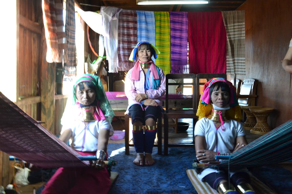 Pas sampai di sebuah rumah yang dari kayu, di papan ada gambar wanita berleher panjang. Lalu turun dari kapal, aku, Melisa dan Ade masuk ke dalam rumah. Di dalam rumah banyak terdapat hasil tenunan yang dijual, nah disinilah 3 wanita berleher panjang sedang menenun. Anehnya 3 kursi sudah disediakan untuk pengunjung bahkan keranjang amal dari plastik untuk merekapun sudah disiapkan. Artinya sudah dipastikan sudah menjadi komersial untuk photo dengan Long–Necked women Myanmar. Kalau berphoto maka bisa memberikan uang seikhlasnya yang sudah tersedia.