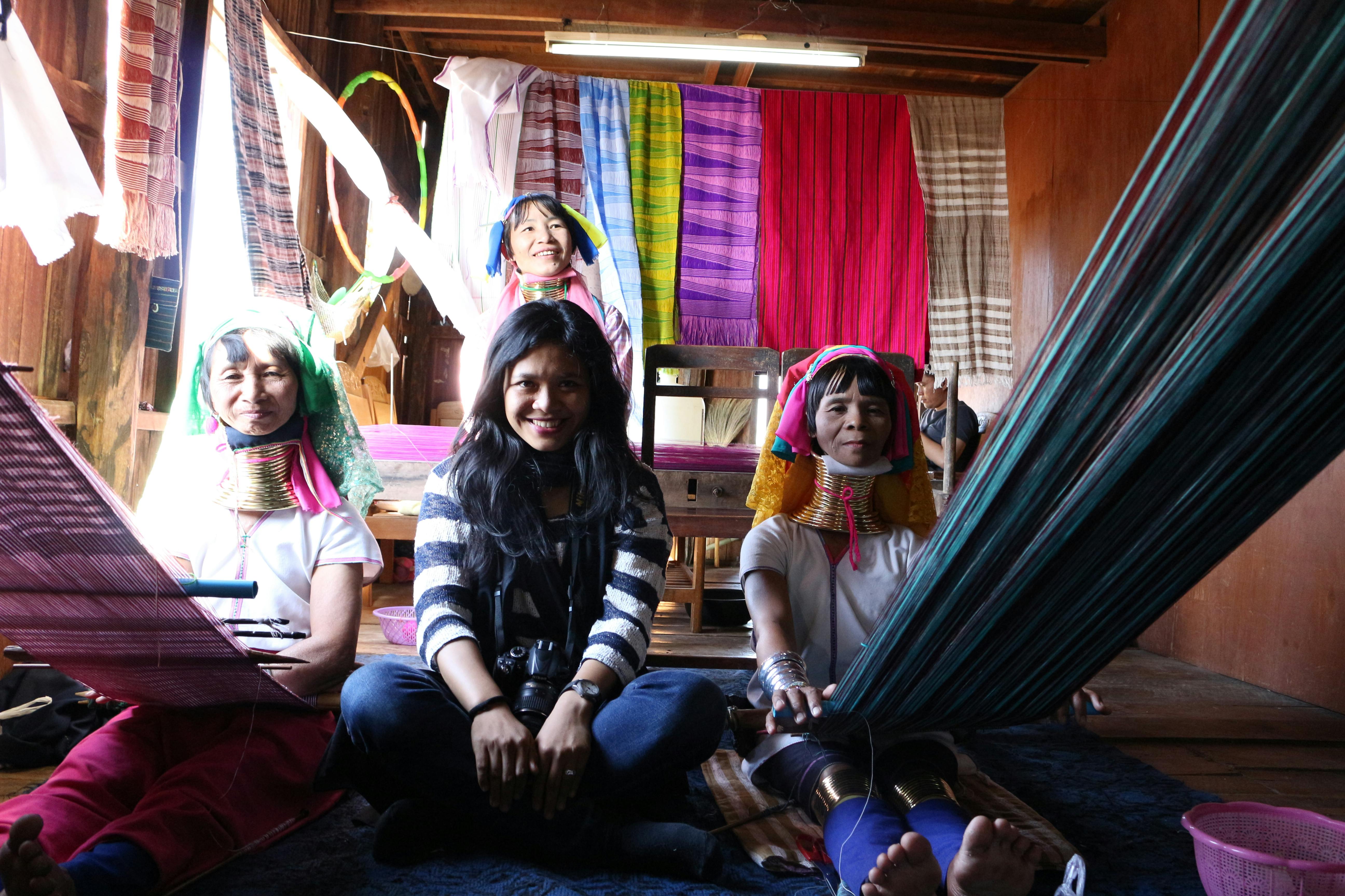 Setelah melakukan aktivitas seharian di Danau Inle dimulai dari subuh-subuh demi mengejar matahari terbit untuk melihat Nelayan Myanmar dengan gaya khas menangkap ikannya, mengunjungi pasar tradisional ala Myanmar untuk membeli Longyi serta melihat pagoda warna-warni, ditambah dengan mampir ke setiap tempat pembuatan kerajinan tangan mulai dari pembuatan tembaga, pembuatan oleh-oleh seperti ukiran, gantungan kunci, patung dari kayu, sampai hasil tenunan dari eceng gondok maka kunjungan yang kami tunggu-tunggu adalah ingin bertemu dengan Wanita berleher panjang tepatnya Pyae Thar Tun Pa Taung, hand weaving centre. Bahkan demi Long–Necked women alias wanita berlehar panjang Melisa rela membatalkan kunjungannya ke Mandalay, tentu saja pilihan itu merupakan pilihan tepat baginya.