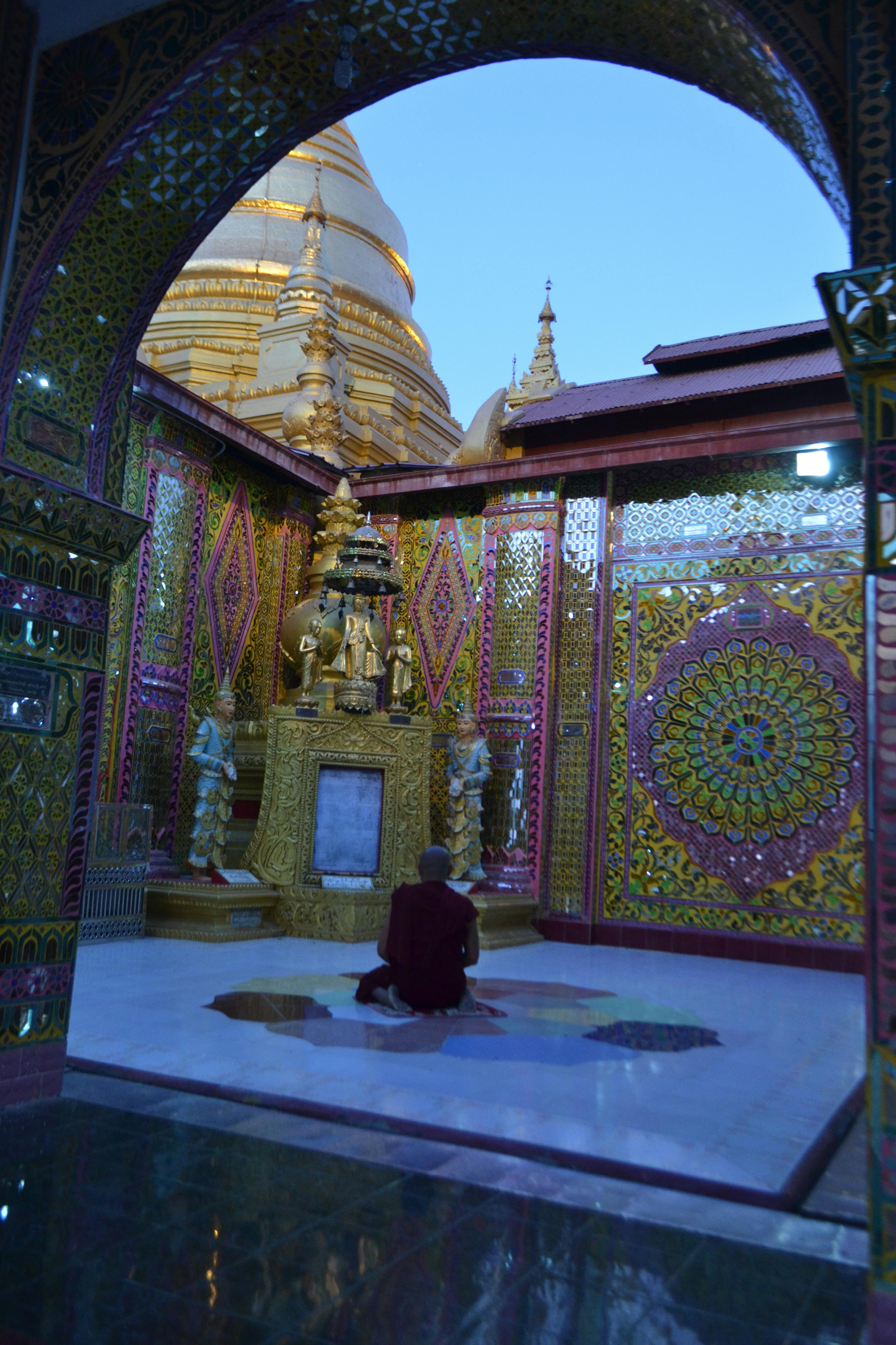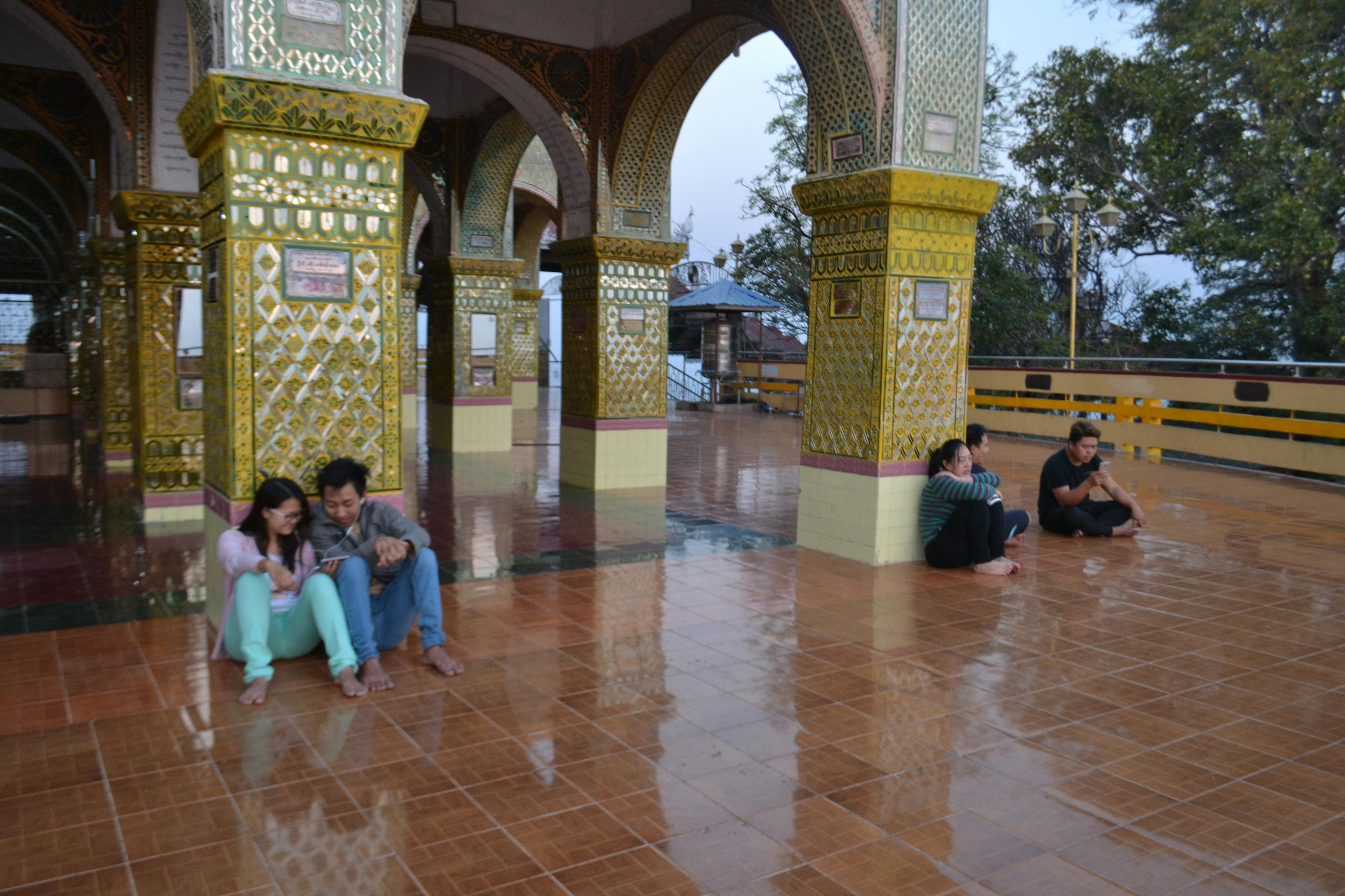 Ketika sampai di Mandalay Hill, kami sempat ragu apakah tempat yang kami kunjungi adalah benar Mandalay Hill karena tidak ada tanda-tanda temple atau cara ke bukit yang seperti Ade bayangkan. Bahkan kami sempat bertanya dimana MANDALAY HILL itu padahal jelas-jelas kami di Mandalay Hill. Bahkan sempat naik ke sebuah tempat seperti pasar terus turun lagi saking tidak yakinnya hingga menanyakan orang kesekian kalinya dimana tempat Hill itu. Rupanya Mandalay Hill melewati pasar yang telah kami lalui, sebuah pasar untuk membeli oleh-oleh tepatnya. Hill tempat sunrise Mandalay berada di area Su Taung Pyae Pagoda dan masuk ke dalam harus membayar uang retribusi 12,000 KS. Agak enggak membayarnya namun karena sudah jauh-juah serta perjuangan melewati jalanan yang menanjak akhirnya kami membayar juga. Di dalam Pagoda hanya ada penjaga saja sementara kami duduk di luar Pagoda menunggu sunrise.