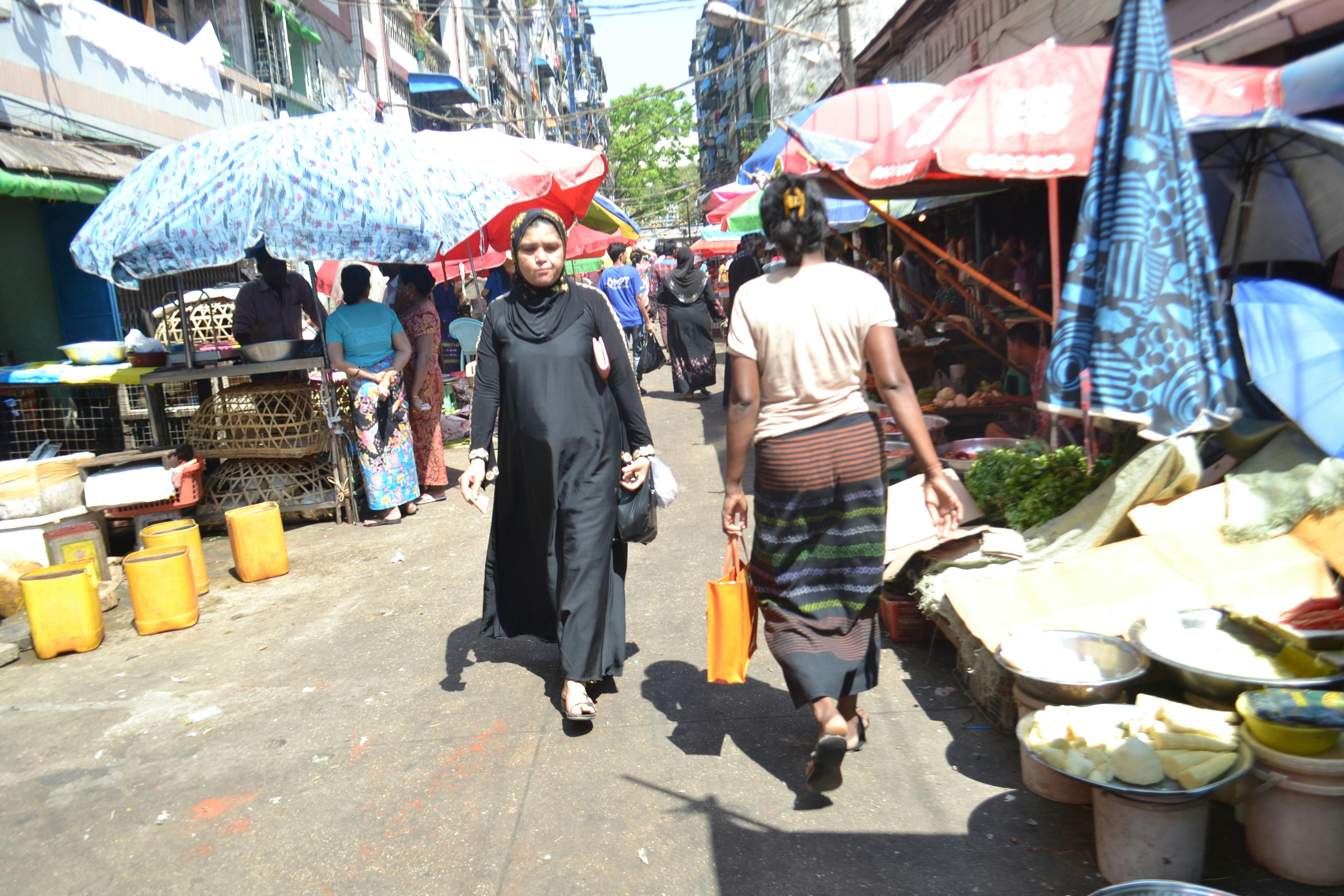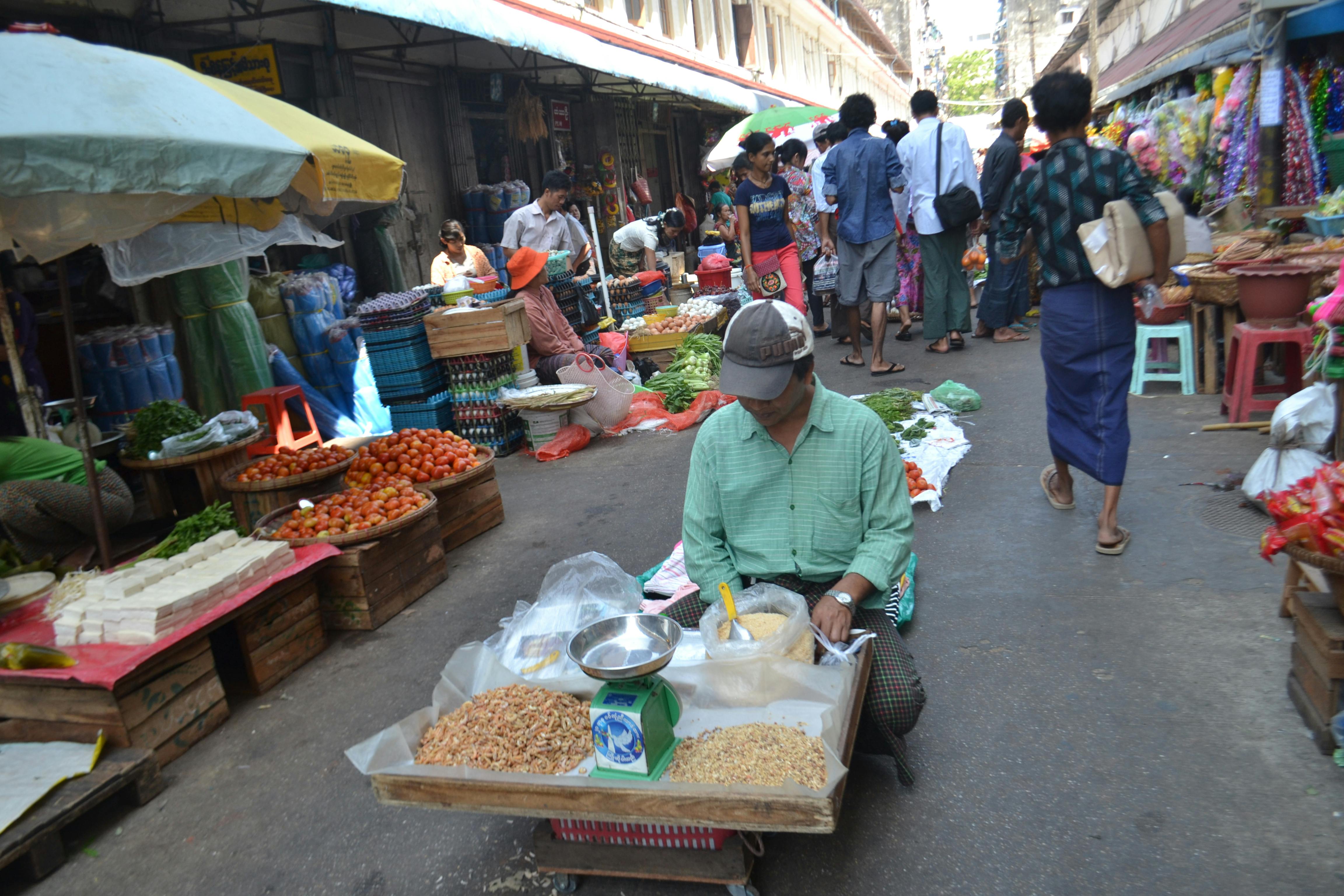 Hal menarik lainnya yang kami lakukan dalam sehari di Yangon ketika aku dan Ade melewati pasar hendak mencari oleh-oleh khas Yangon. Tapi jangan ditanya apa kami dapat oleh-olehnya karena jawabannya tidak. Pasar tempat oleh-oleh sedang tutup. Akhirnya kami melewati pasar ala Myanmar dengan berjalan kaki sambil mengamati kegiatan penduduk lokal. Menariknya ada kejadian sayuran yang dilewati mobil namun sayurnya tidak rusak, tepat hanya melintasi saja. Di pasar Yangon tak jauh dari area Sule Pagoda jugalah kami menemukan beberapa warga Muslim hal ini terlihat dengan jilbabnya, karena mengingat kasus di Myanmar saat ini.