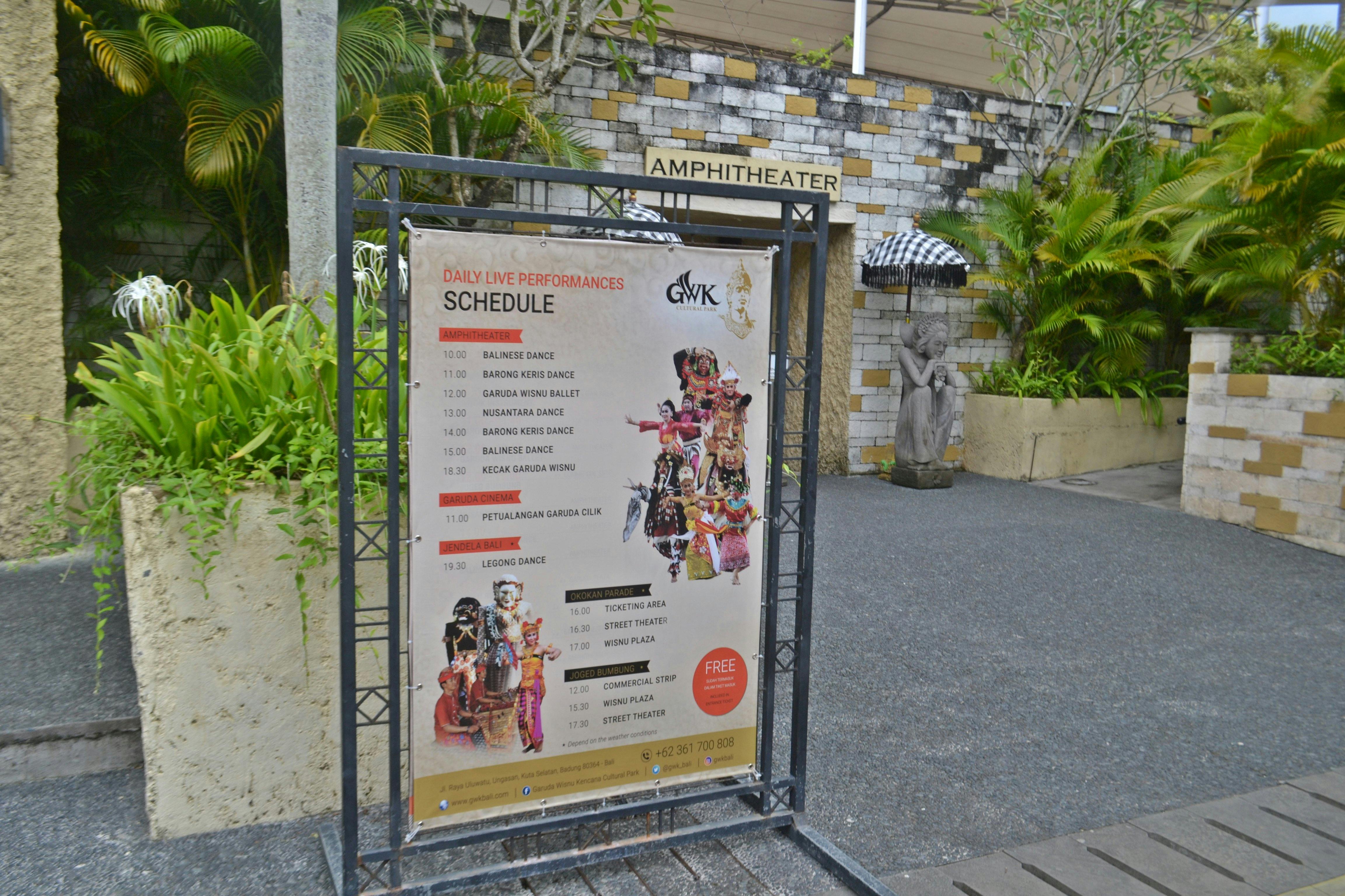 Untuk pertunjukan apa saha di Amphitheatre selama seharian, maka jadwal dan pertunjukan dapat dilihat di depan pintu Amphitheatre. Jadi tak heran kalau GWK ini dapat melihat pertunjukan menarik khas Bali.