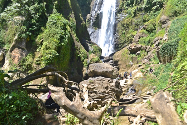 Akhirnya aku harus memegang Nisa sambil melewati jembatan pohon kayu. Yang paling membuat jantung berdecak kencang saat melompati pohon ke tanah, duh bikin deg-degan. Tapi terbayar dengan keindahan Air Terjun Silima-lima.