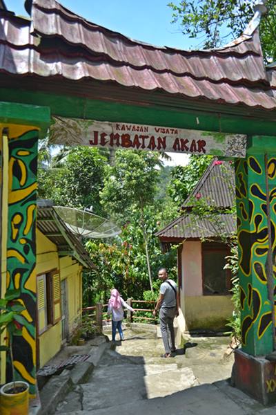 Nah setelah makan kami sekalian sholat zuhur. Sekitar jam setengah dua siang barulah kami sampai di Jembatan Akar. Untuk masuk ke Jembatan Akar, kami membayar tiket masuk Jembatan Akar seharga Rp5.000 dan parkir Rp5.000 sehingga untuk kami bertiga kena Rp20.000.